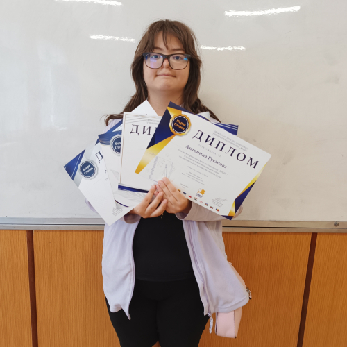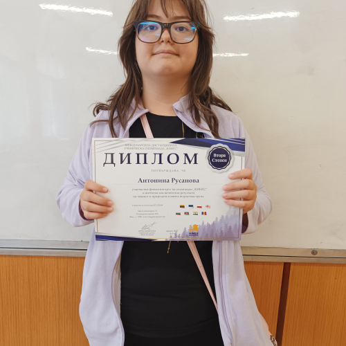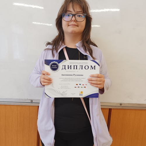 Поредно отличие за Антонина Русанова от 7б клас. След участие и отлично представяне във всички етапи на състезанието тя достигна до Финалния кръг на Международната олимпиада Кингс. Антонина получи Диплом I степен по английски език и Диплом II по математика, български език и литература и човекът и природата. Пожелаваме на Антонина още повече успехи и все такъв ентусиазъм.