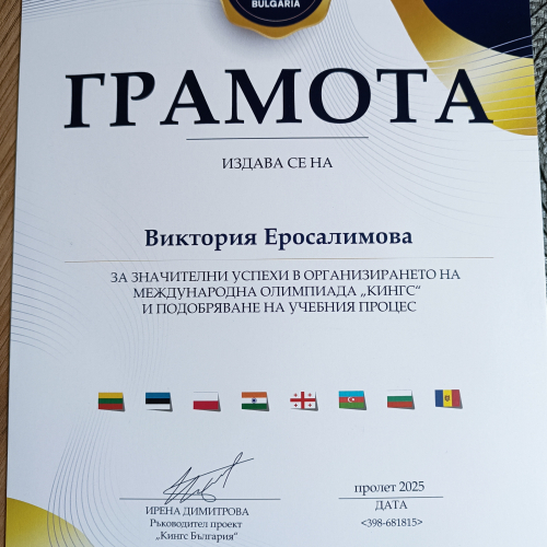 Грамота получи и г-жа Виктория Еросалимова – учител по математика за значителни успехи в организирането на Международна олимпиада „Кингс“ и подобряване на учебния процес.