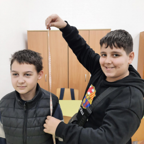 В практическата част учениците работиха по двойки и измерваха пропорции на собственото си тяло, за да проверят дали се доближават до златното отношение. Те изчисляваха резултатите и ги сравняваха, което затвърди уменията им за работа с дроби и деление в реален контекст.