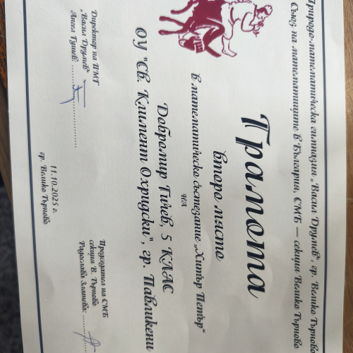 Ученици от ОУ „Св. Климент Охридски“ се представиха успешно в математическото състезание „Хитър Петър“, проведено в ПМГ „Васил Друмев“ гр. Велико Търново, организирано от Съюз на математиците в България – секция Велико Търново.